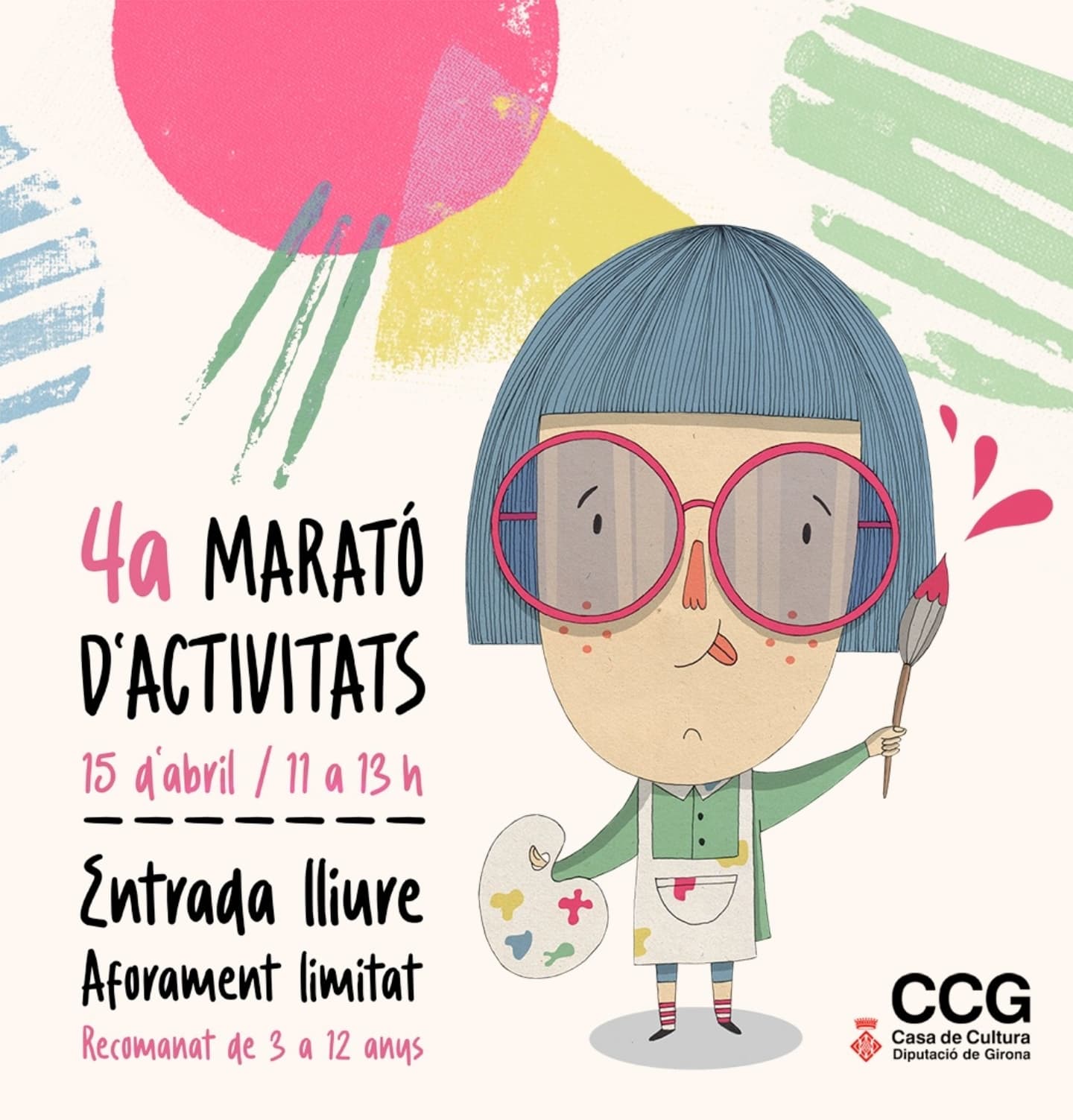El dimarts 15 d’abril tindrà lloc al pati de la Casa de Cultura de Girona la IV Marató d’Activitats, adreçada a famílies amb nens i nenes de 3 a 12 anys. Enguany podreu gaudir d’activitats que permetran als més petits endinsar-se en el món de les arts plàstiques: fang, pintura, paper...